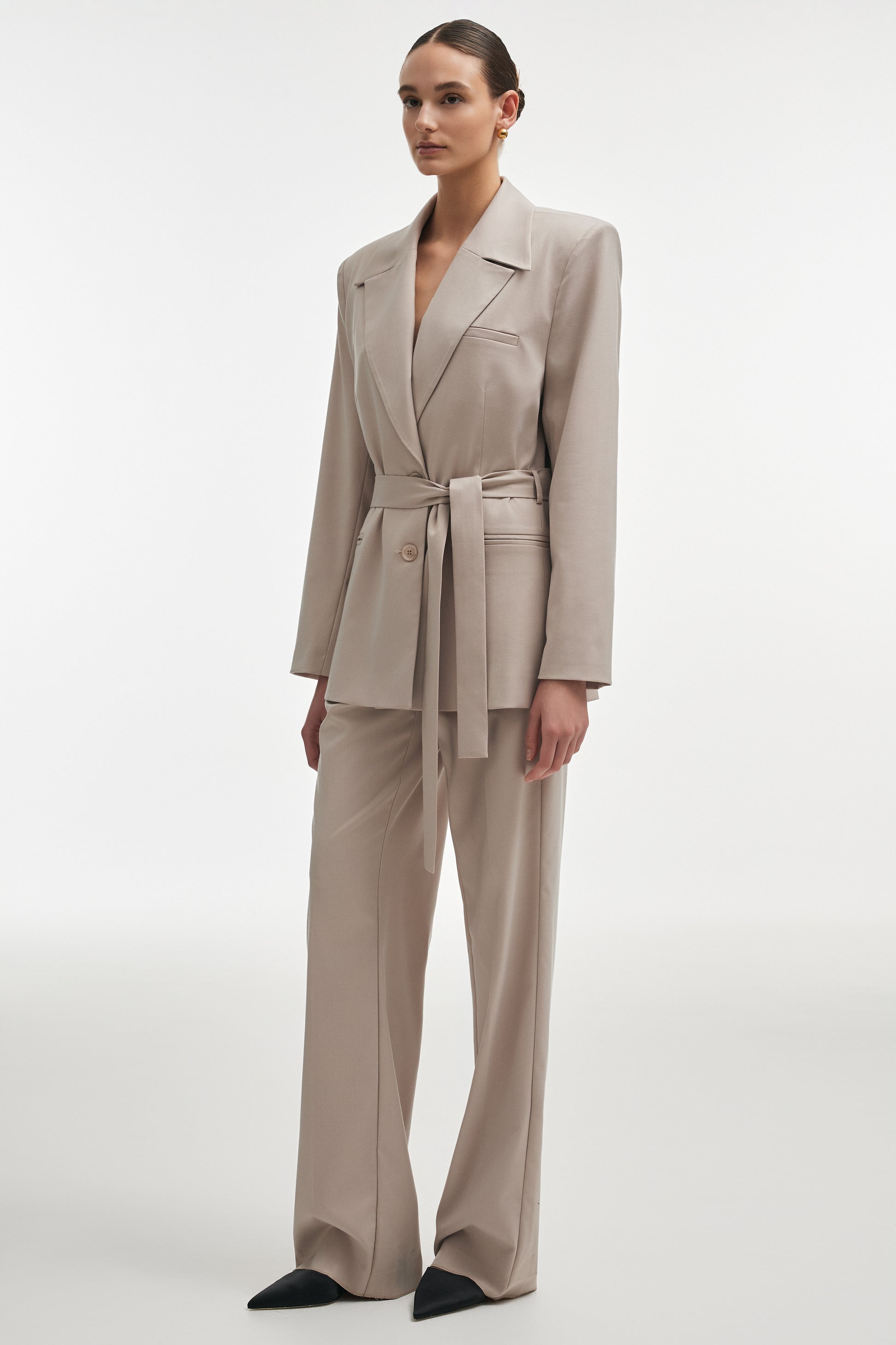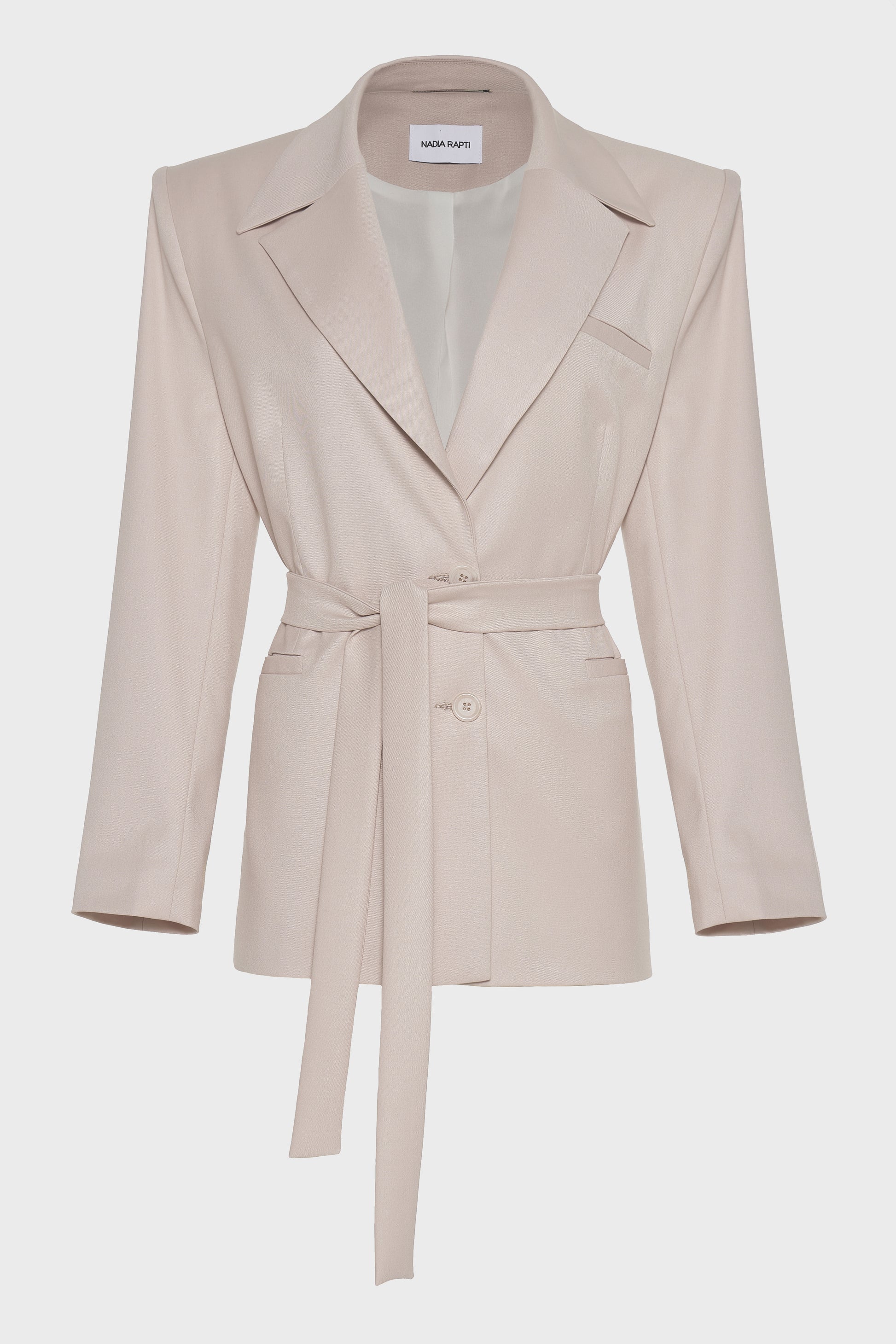 Elevate your wardrobe with the Nadia Rapti Aura Blazer in sophisticated grey. Crafted from soft diagonal weave fabric, this tailored piece features padded shoulders for a polished silhouette and long sleeves for versatile styling. A coordinating belt cinches the waist while practical side pockets add functionality. Perfect for professional settings or elevated casual looks, this blazer combines comfort with contemporary elegance.